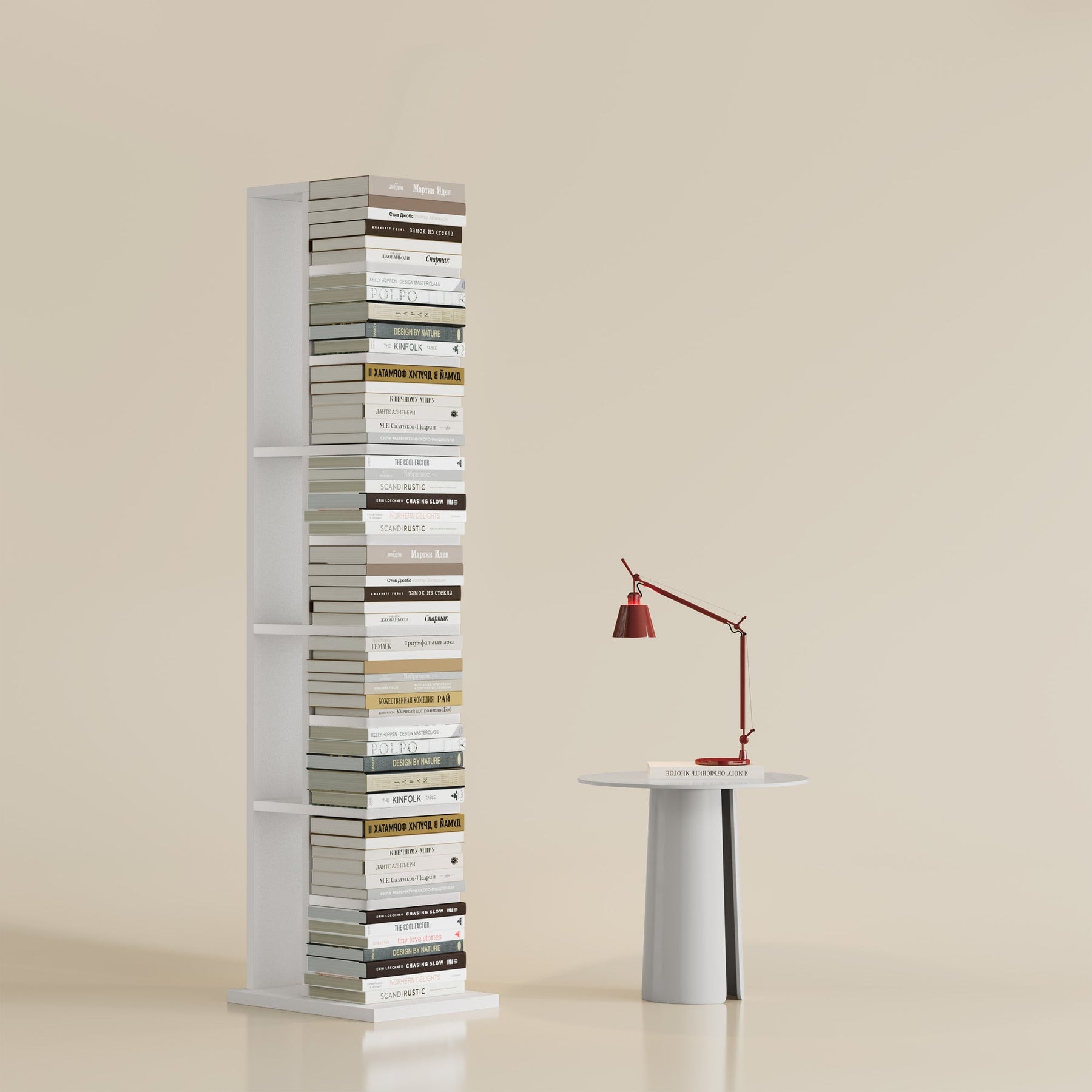 Mirage — Inspirado na miragem — a ilusão etérea do deserto nascida da luz refratada. Encha as nove prateleiras ricas com os seus livros preciosos e observe o encantamento do design central desdobrar-se: cada prateleira marcante funde-se perfeitamente no espaço de fundo, desaparecendo por baixo da sua coleção.