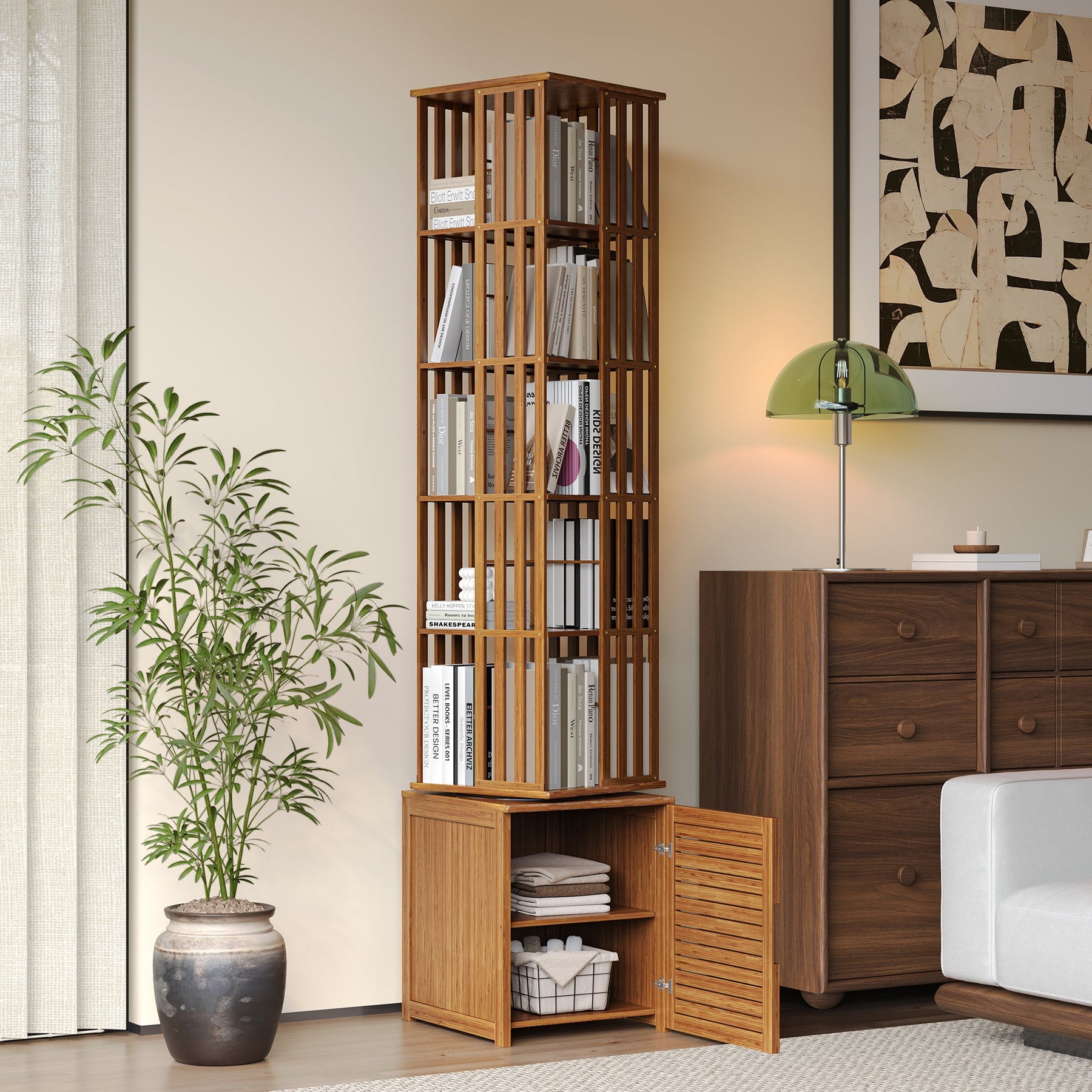 Esta estante, com padrão vazado vertical em malha, oferece uma plataforma extra para organizar os seus livros e objetos. A base rotativa a 360° com rodas permite aceder facilmente à prateleira desejada, tornando o uso mais prático e intuitivo.