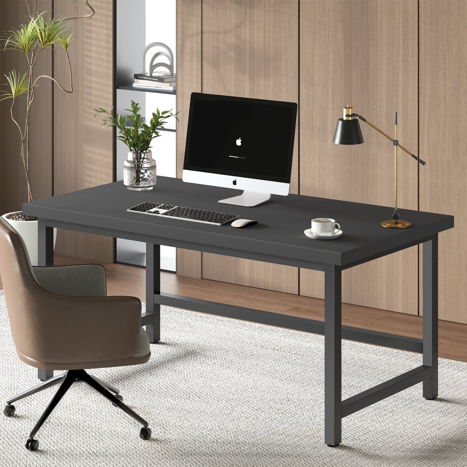 Esta secretária de 120 cm e 155 cm apresenta linhas modernas, acabamento suave em madeira preta e uma superfície generosa que se adapta facilmente a qualquer escritório em casa, quarto ou canto de estudo.