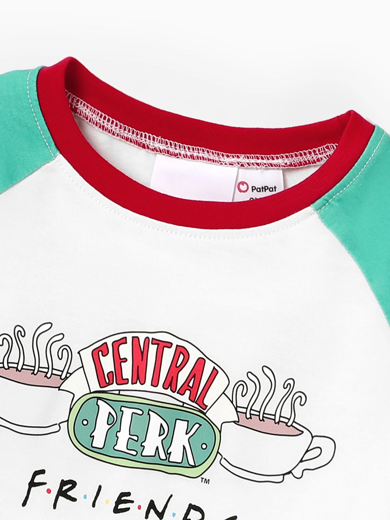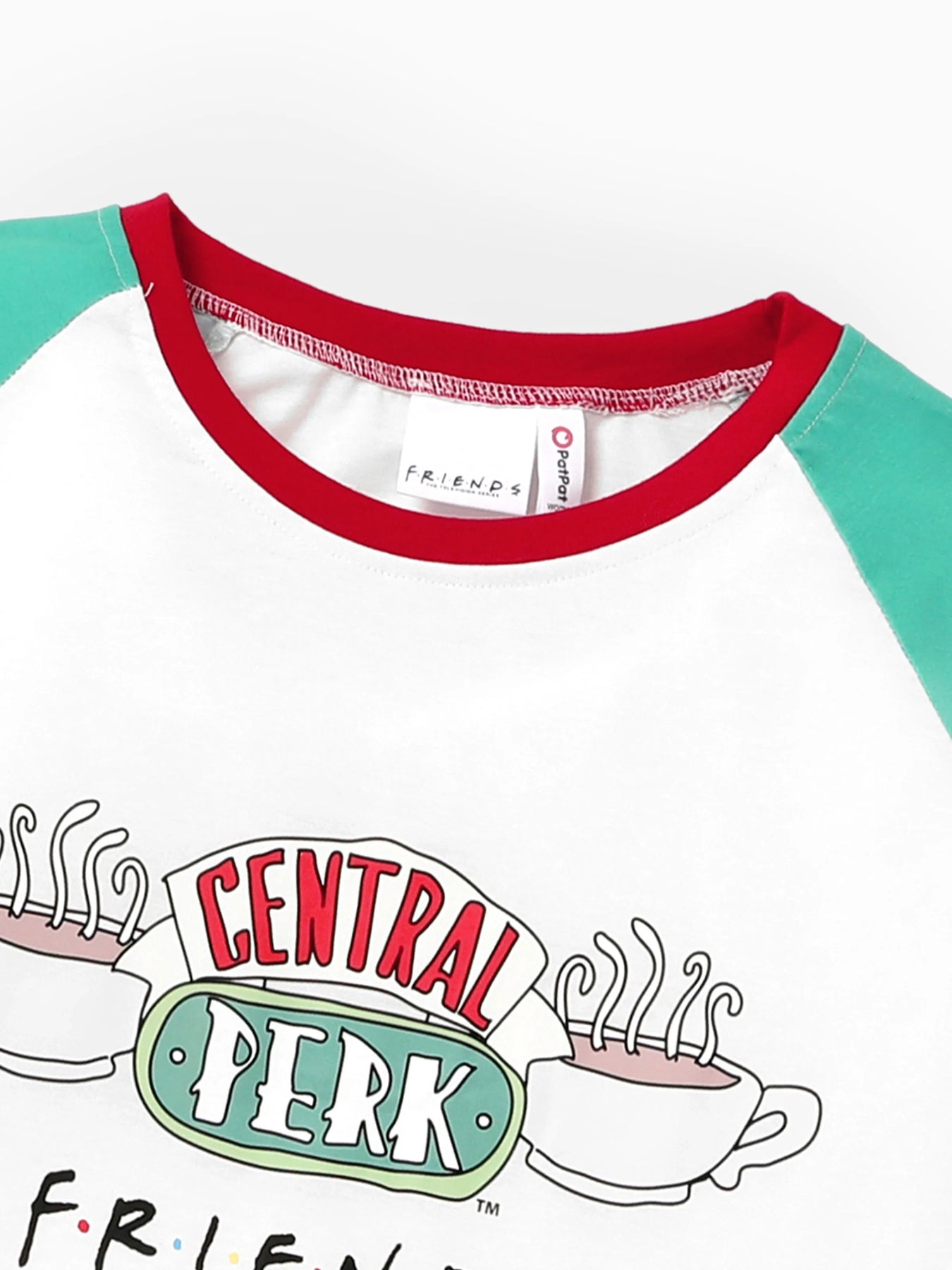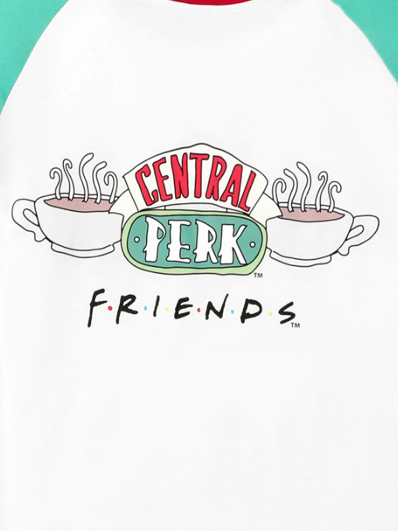 Este conjunto de pijamas festivo da Friends™ apresenta o icónico logótipo do Central Perk e o texto "Friends". O design em bloco de cores vermelho, verde e branco, combinado com as calças de padrão temática natalícia, tornam-no ideal para momentos em família e fotografias de Natal. Disponível para adultos, crianças e bebés.