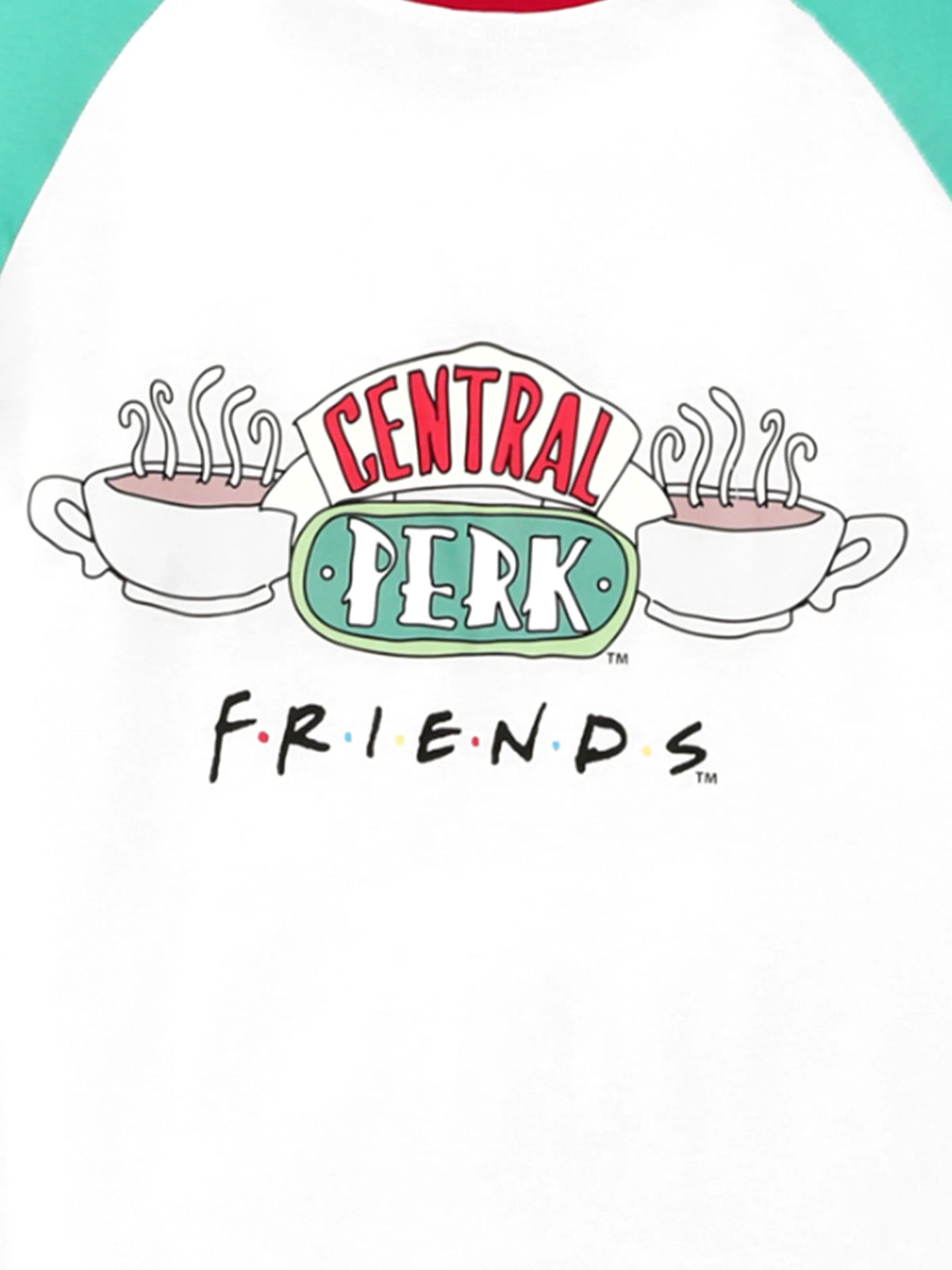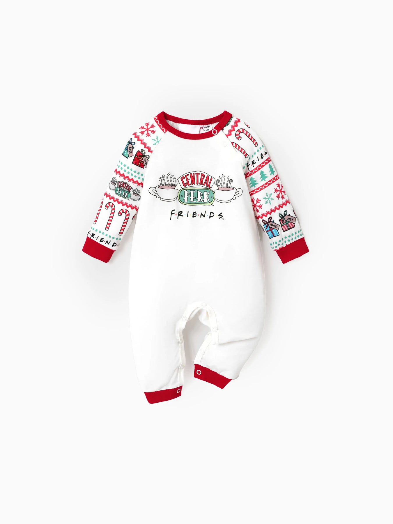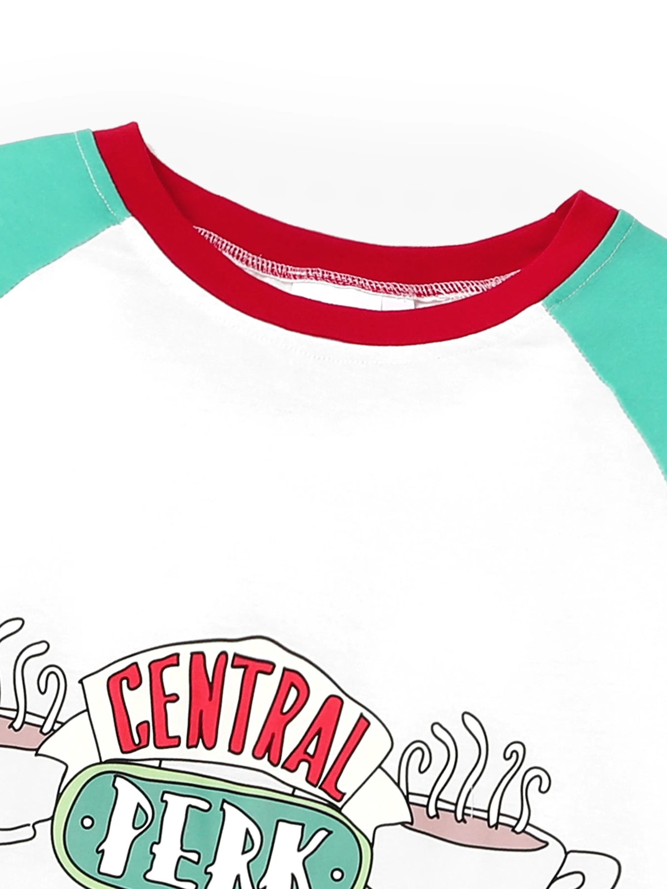 Este conjunto de pijamas festivo da Friends™ apresenta o icónico logótipo do Central Perk e o texto "Friends". O design em bloco de cores vermelho, verde e branco, combinado com as calças de padrão temática natalícia, tornam-no ideal para momentos em família e fotografias de Natal. Disponível para adultos, crianças e bebés.