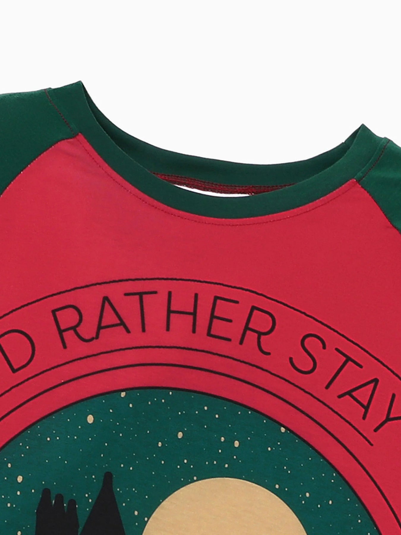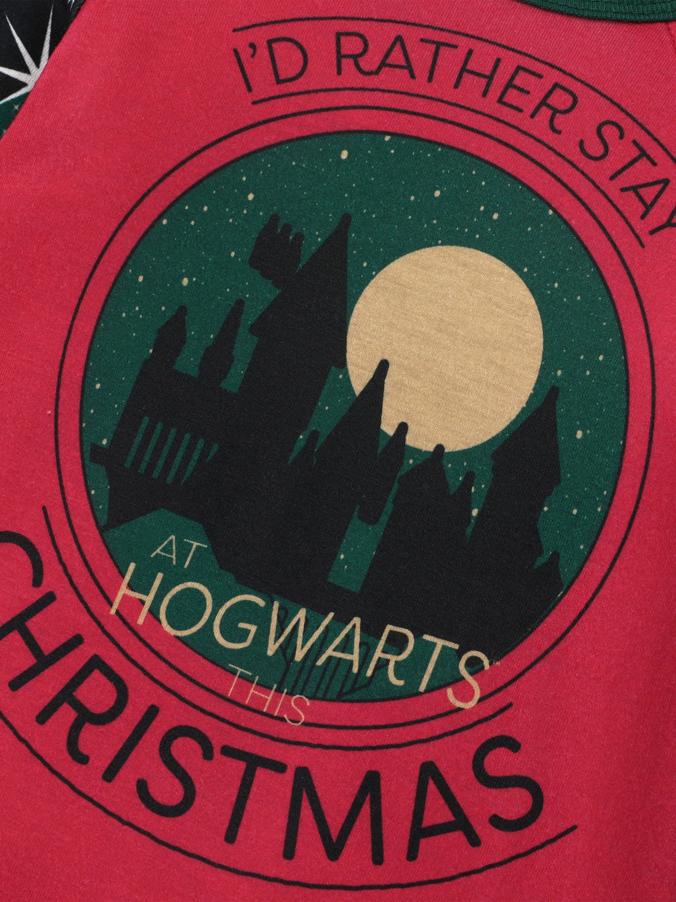 Celebre o Natal com este conjunto de pajamas de família temático de Hogwarts, apresentando a frase "Prefiro Ficar em Hogwarts", um design festivo em blocos de cores vermelho e verde, e calças com padrão de luzes de Natal.