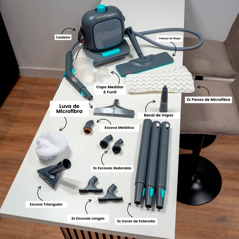O Limpador a Vapor Multiusos adapta-se a qualquer rotina: limpeza profunda, superfícies delicadas, acessórios versáteis e potência real para transformar o dia a dia.